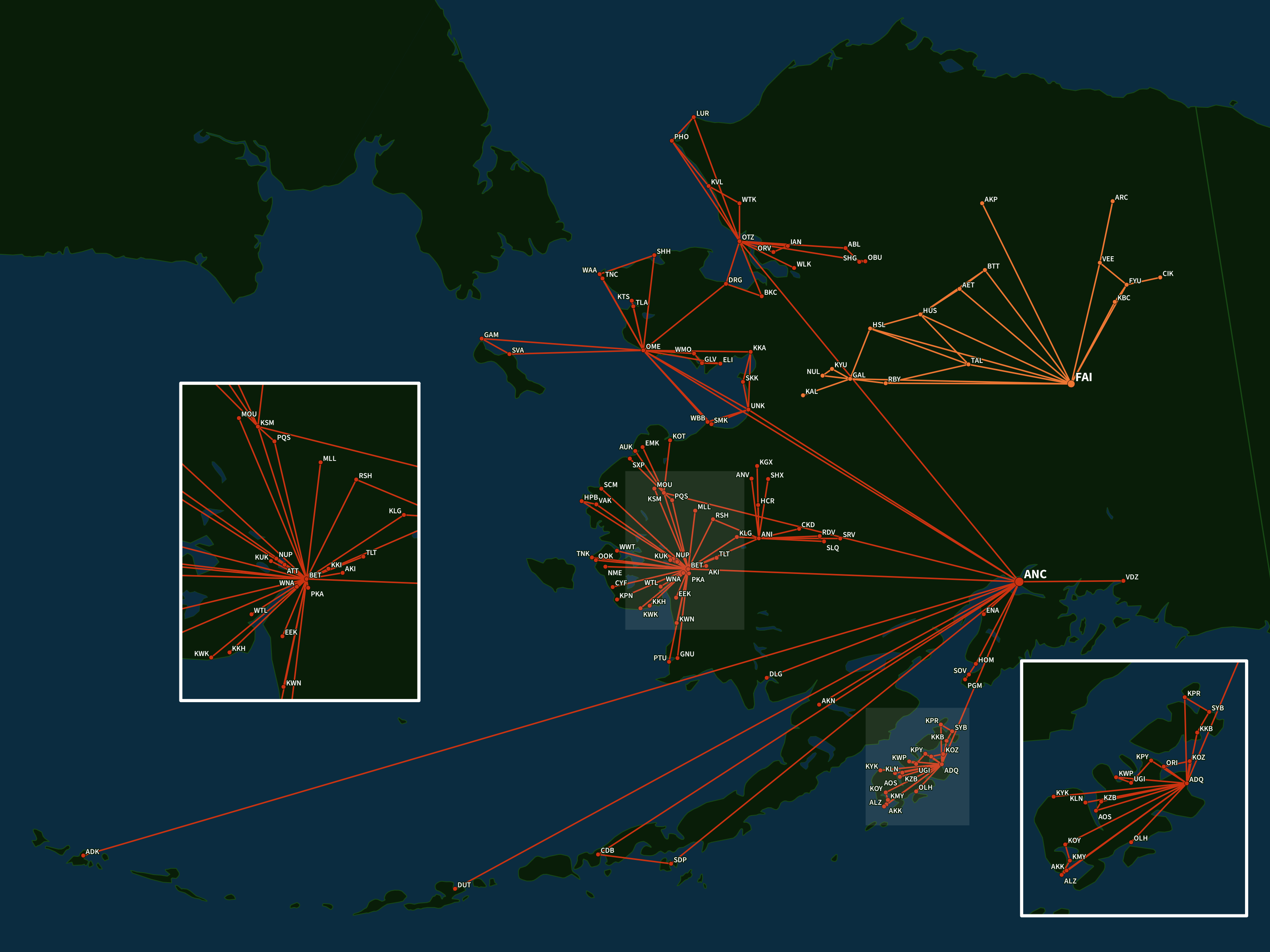 The networks were even bigger in some places. As mentioned above, Alaska in particular has extensive networks of flights between tiny airports—but some of those networks only connect through a single hub.