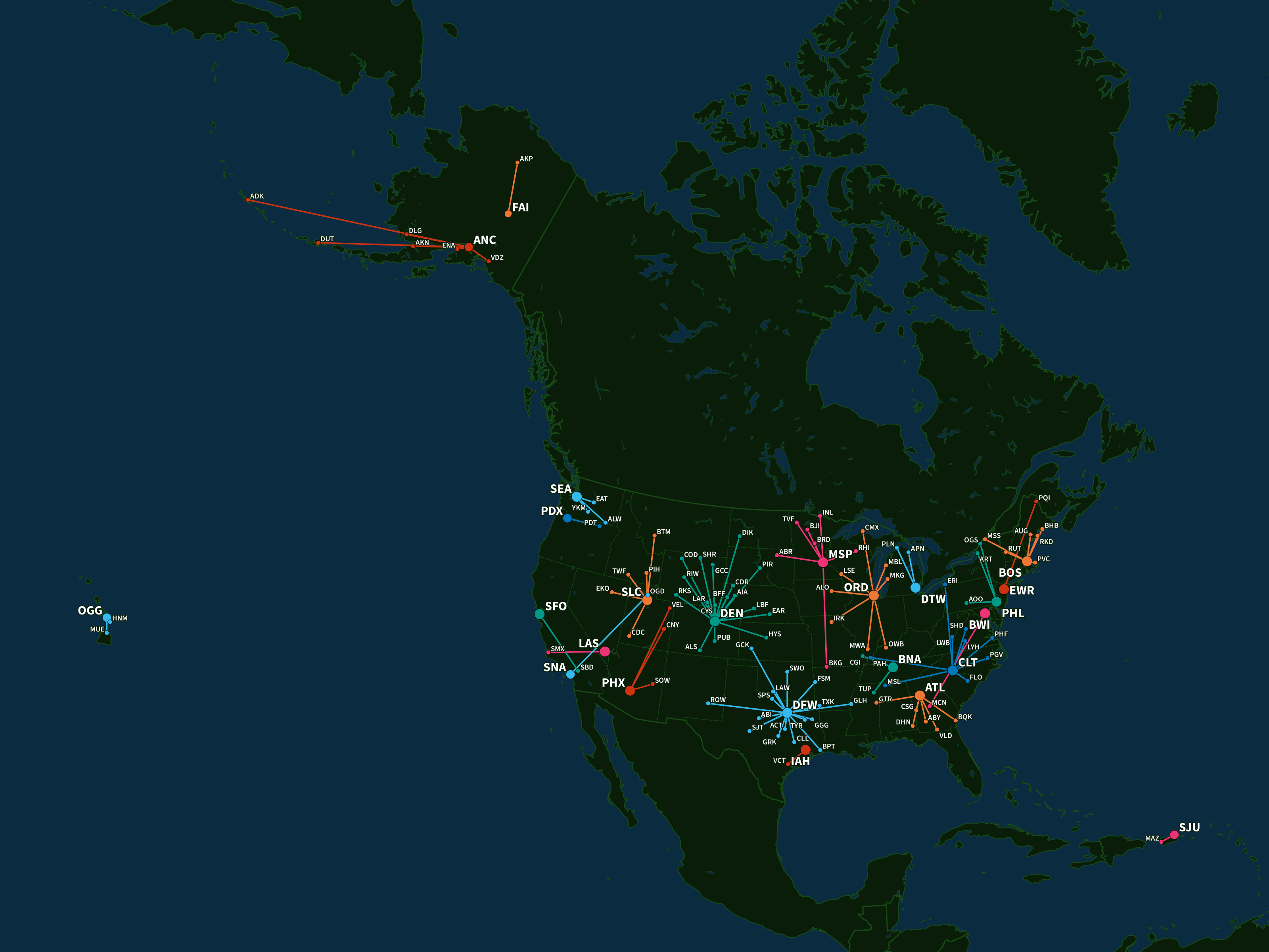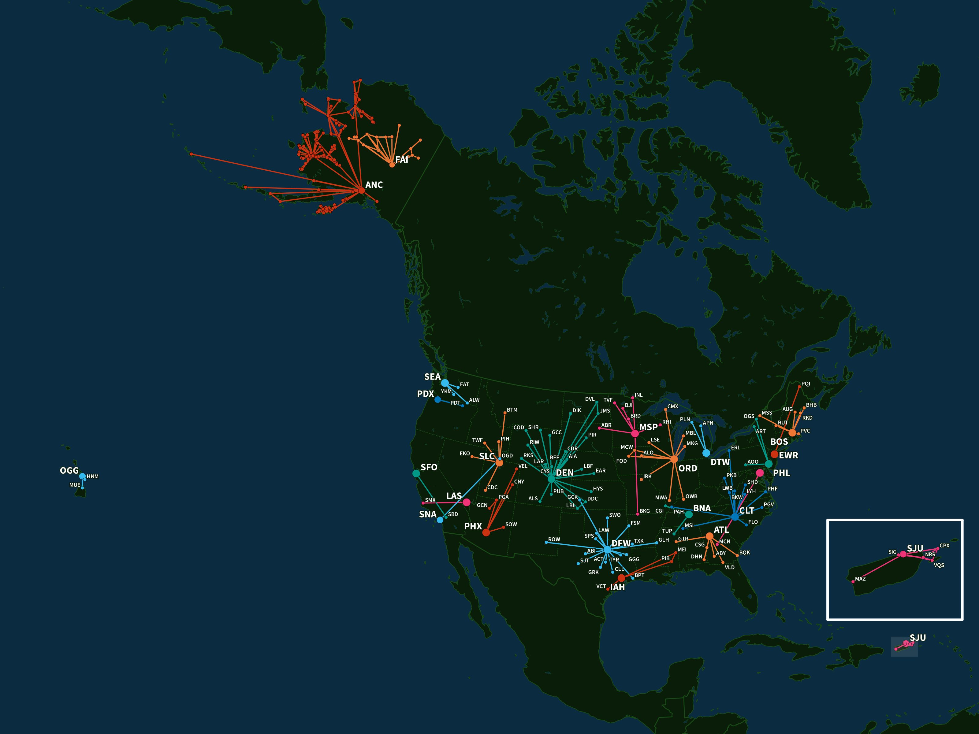 In the same way that individual airports could belong to a single hub, these networks could belong to a single hub. To show this, I also created a map of each hub’s networks, as well as a zoomed-in version detailing Alaska’s hub networks: