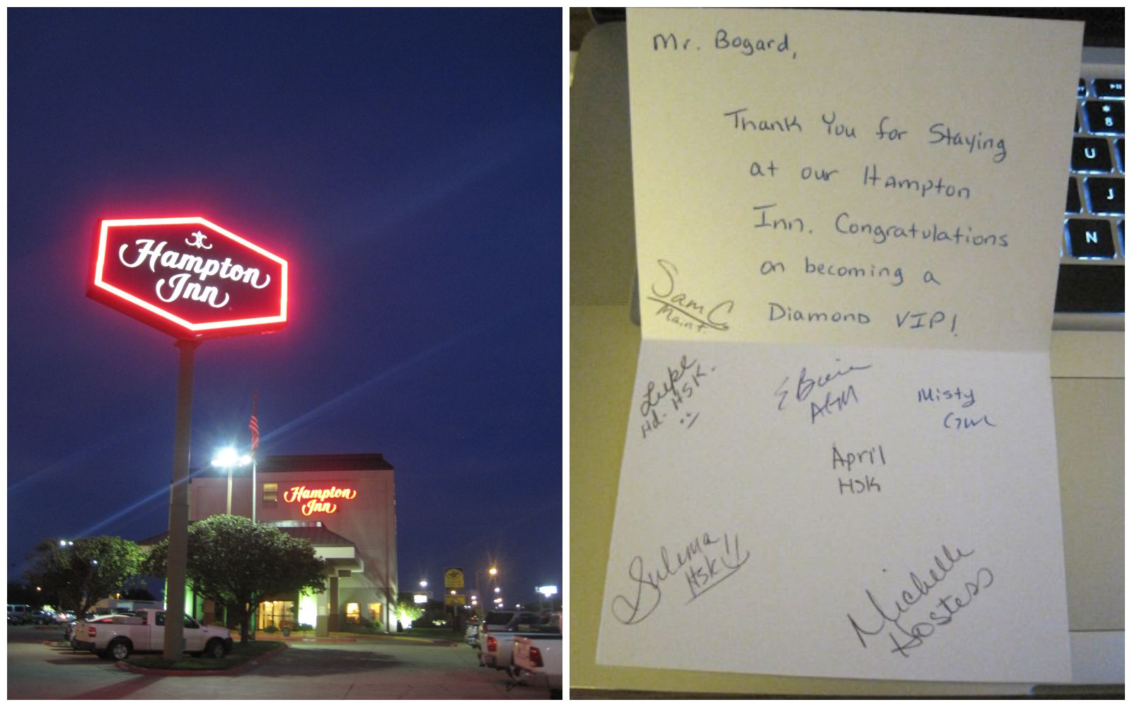 My first stay as a Diamond member was the very next week at the Hampton Inn Abilene (Texas, USA), who gave me a card welcoming me to Diamond. (They also sent me a Christmas card one year!)