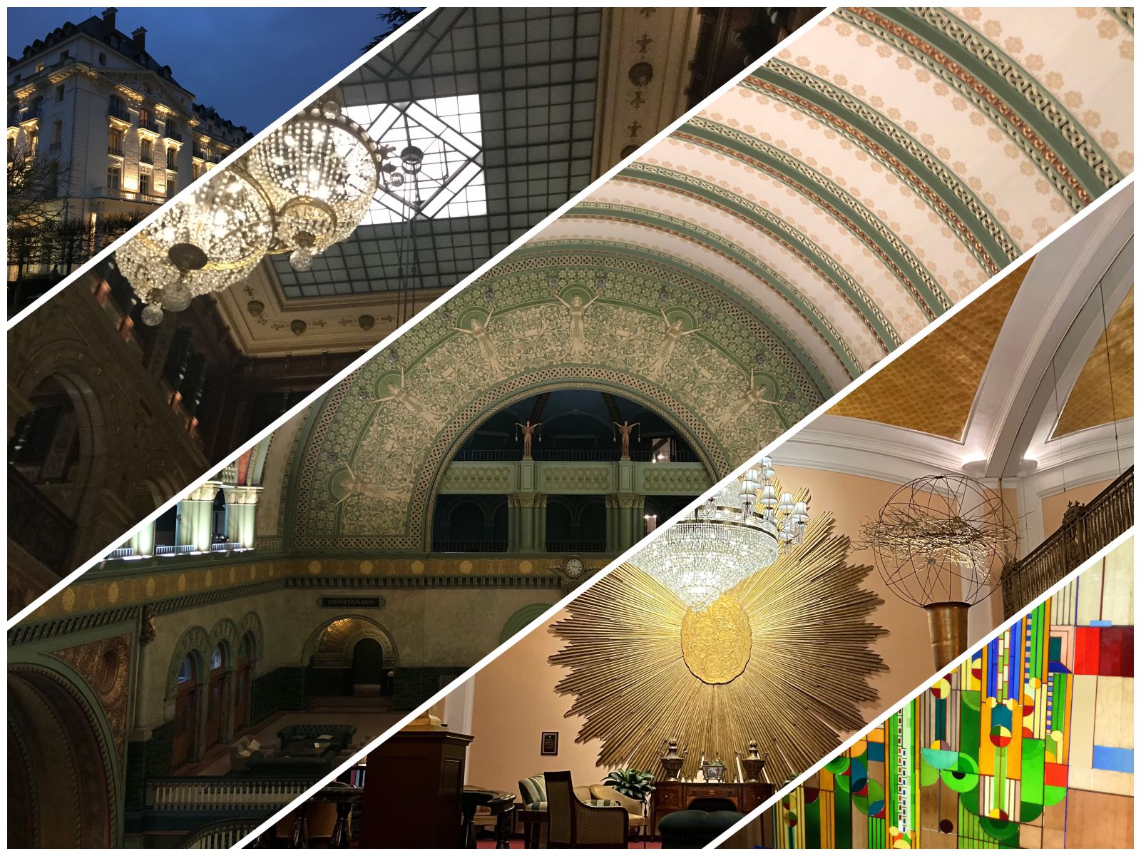 Left to Right: Waldorf Astoria Versailles – Trianon Palace (France); Hilton Paris Opera (France); St. Louis Union Station Hotel (Missouri, USA); Amway Grand Plaza (Grand Rapids, Michigan, USA); Frank Lloyd Wright’s Saguaro Forms and Cactus Flowers in stained glass at Arizona Biltmore (Phoenix, Arizona, USA).