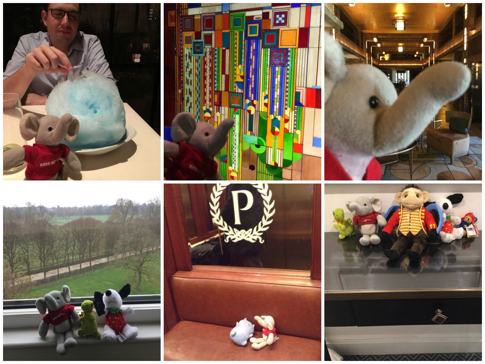 We’ve done the traveling gnome photo concept on occasion, mostly with Rosie (the elephant mascot of my college), but sometimes with other animals. First row: three photos at the Arizona Biltmore (Phoenix, Arizona, USA). Second row: Waldorf Astoria Versailles – Trianon Palace (France); leather elevator seat at the Palmer House (Chicago, Illinois, USA); The Waldorf Hilton (London, UK).
