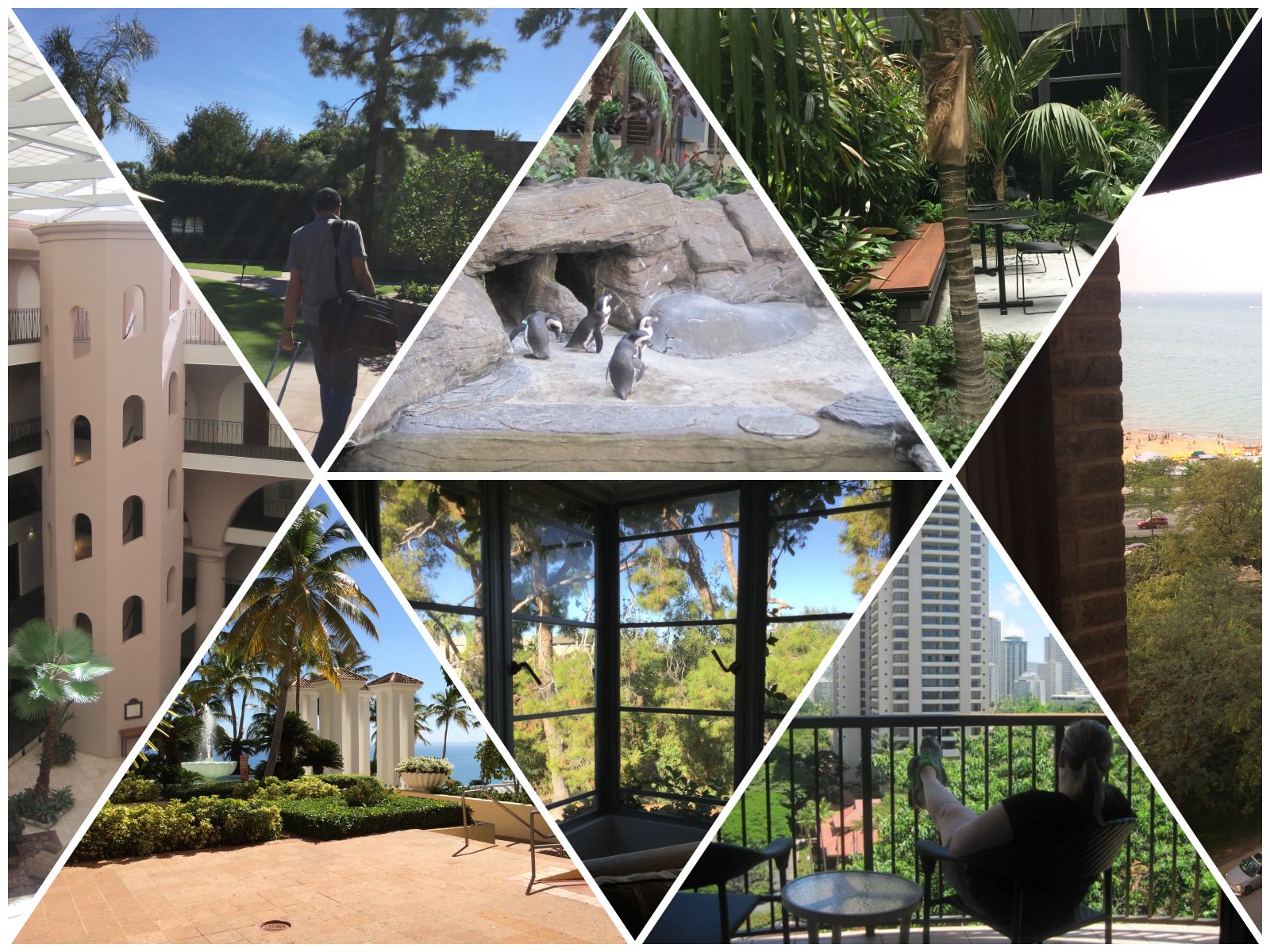 Clockwise from left: Embassy Suites by Hilton Charleston Historic District (South Carolina, USA); Arizona Biltmore (Phoenix, Arizona, USA); penguins at the Hilton Hawaiian Village (Honolulu, Hawaii, USA); garden courtyard at the West Hotel Sydney (New South Wales, Australia); view of Lake Michigan from The Drake Hotel (Chicago, Illinois, USA); Rainbow Tower balcony at the Hilton Hawaiian Village (Honolulu, Hawaii, USA); Arizona Biltmore (Phoenix, Arizona, USA); El Conquistador Resort (Fajardo, Puerto Rico).