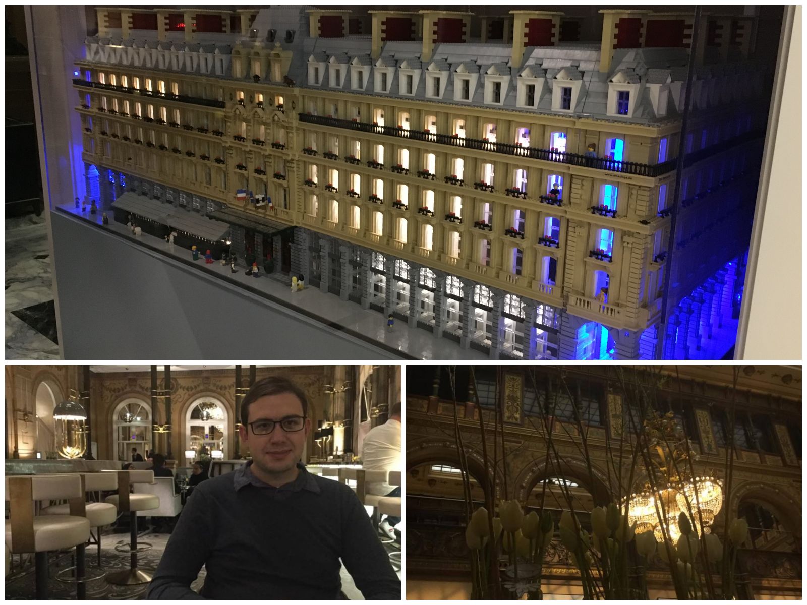 Three views of the Hilton Paris Opera (France), including a LEGO model of the hotel in the lobby of the hotel.