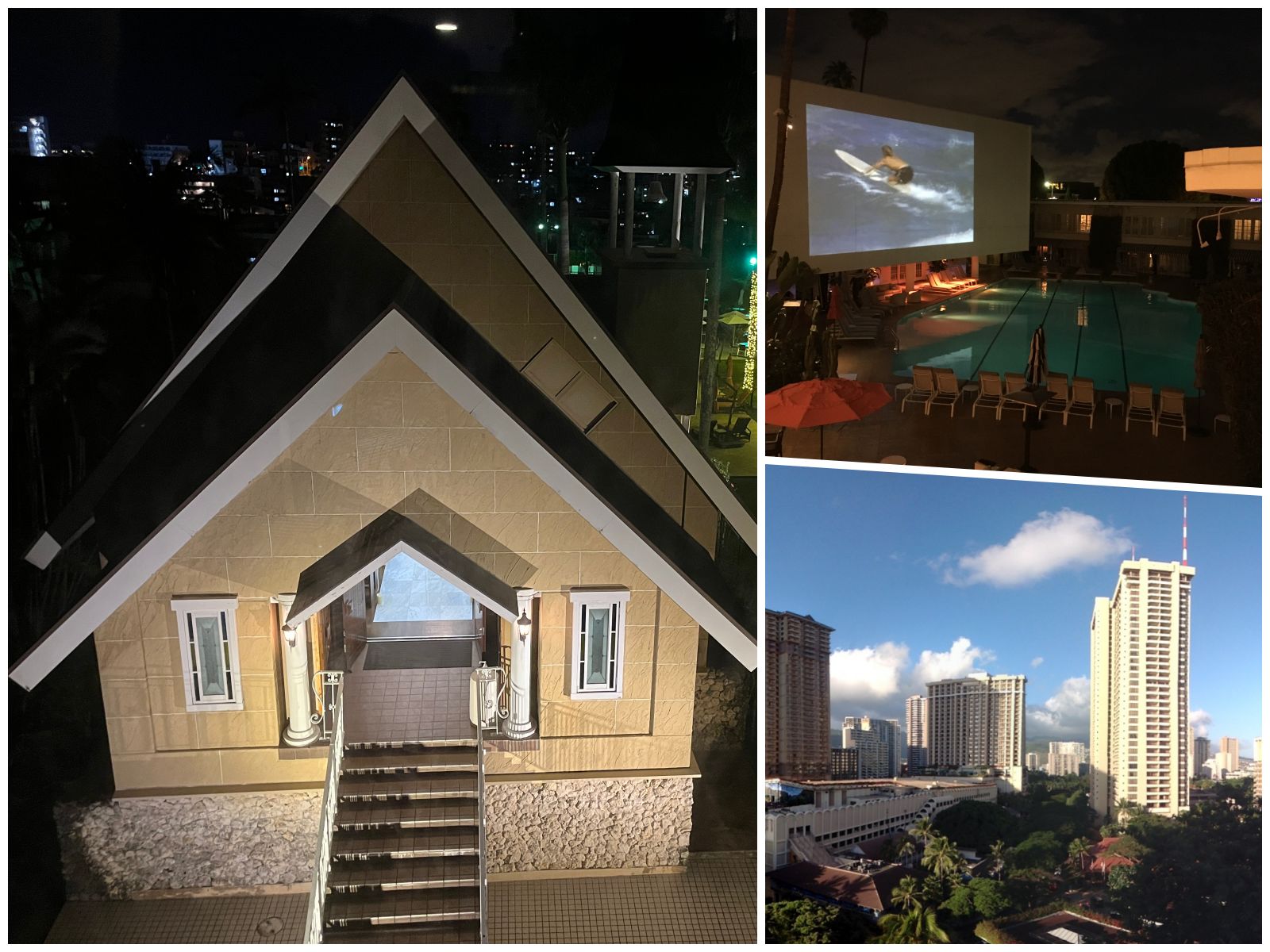 Clockwise from left: chapel at the DoubleTree by Hilton Hotel Naha Shuri Castle (Okinawa, Japan); poolside movies at the Beverley Hilton (Beverley Hills, California, USA); view from a Rainbow Tower balcony at the Hilton Hawaiian Village (Honolulu, Hawaii, USA).