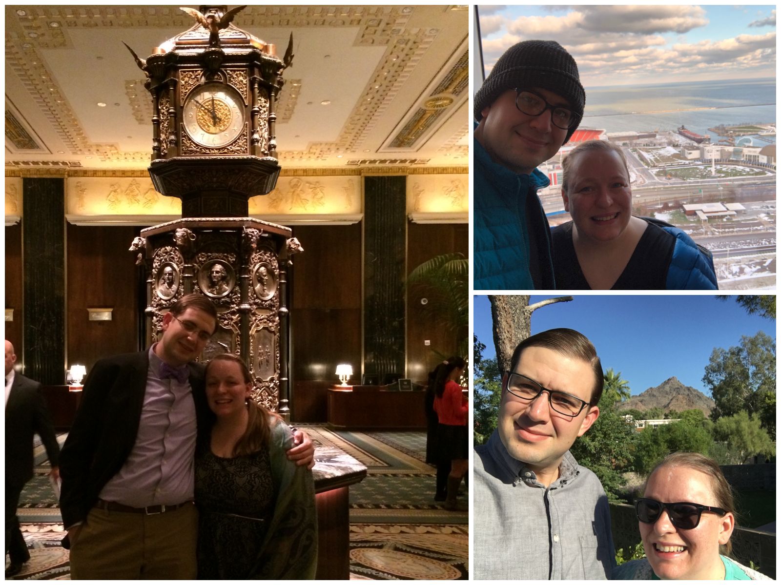 My wife Amy and I at several hotels. Clockwise from left: Waldorf Astoria New York (New York, USA); Hilton Cleveland Downtown (Ohio, USA); El Conquistador Tucson Resort (Arizona, USA).