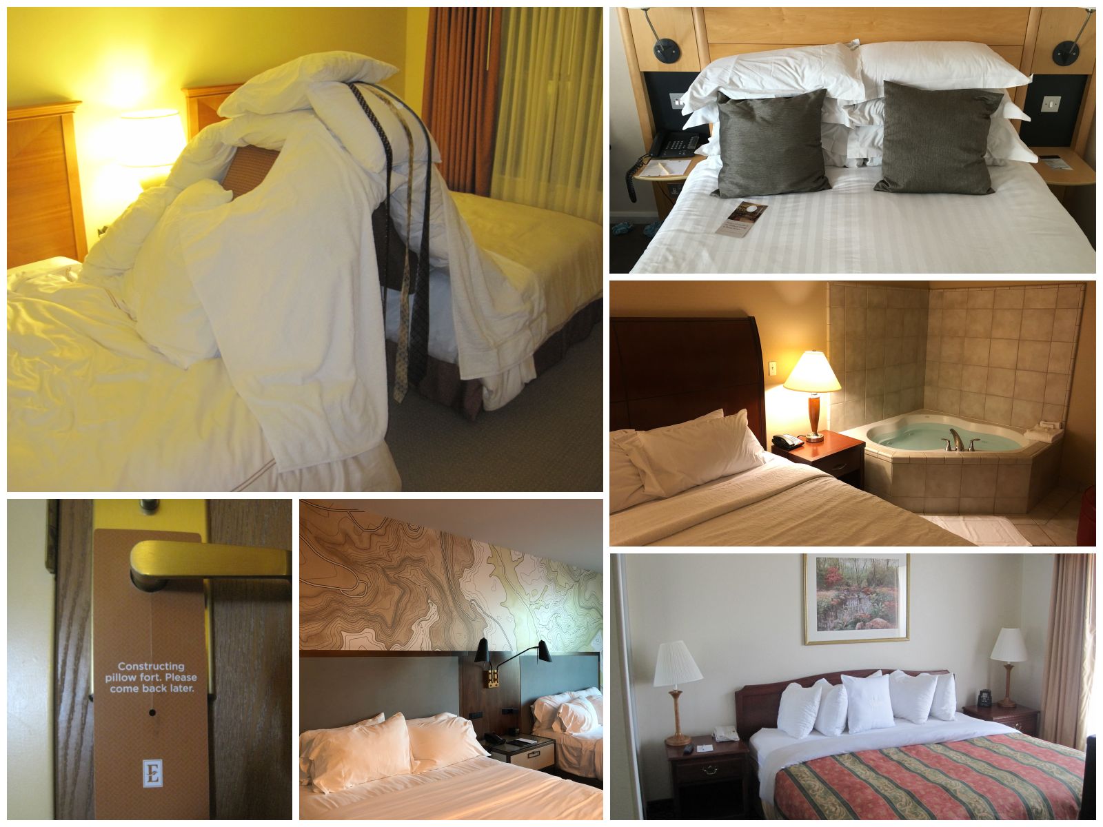 Clockwise from top left: pillow fort at the Homewood Suites by Hilton Dulles-North/Loudoun (Virginia, USA); extra pillows at the DoubleTree by Hilton Hotel London – Westminster (UK); in-bedroom hot tub at the Hilton Garden Inn Palmdale (California, USA); Homewood Suites by Hilton Dallas-Arlington (Texas, USA); topographic contour map wallpaper of the nearby Palo Duro Canyon at the Embassy Suites by Hilton Amarillo Downtown (Texas, USA); pillow fort door sign at the Embassy Suites by Hilton Charleston Airport (South Carolina, USA).