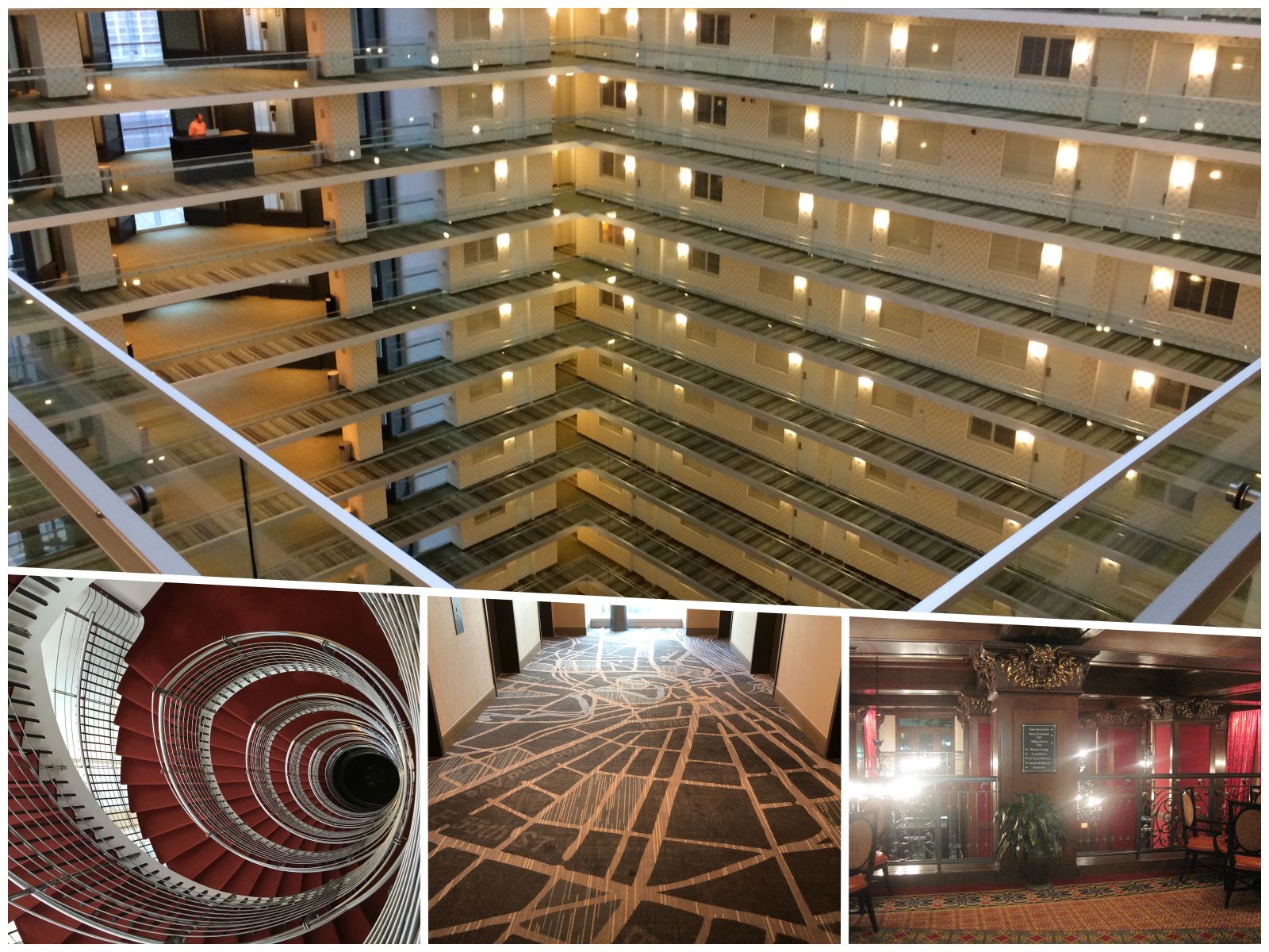 Clockwise from top: atrium at the Embassy Suites by Hilton Chicago Downtown Magnificent Mile (Illinois, USA); mezzanine at The Skirvin Hilton (Oklahoma City, Oklahoma, USA); map carpet at the Hilton Cleveland Downtown (Ohio, USA); spiral staircase at the Hilton Reykjavik Nordica (Iceland).