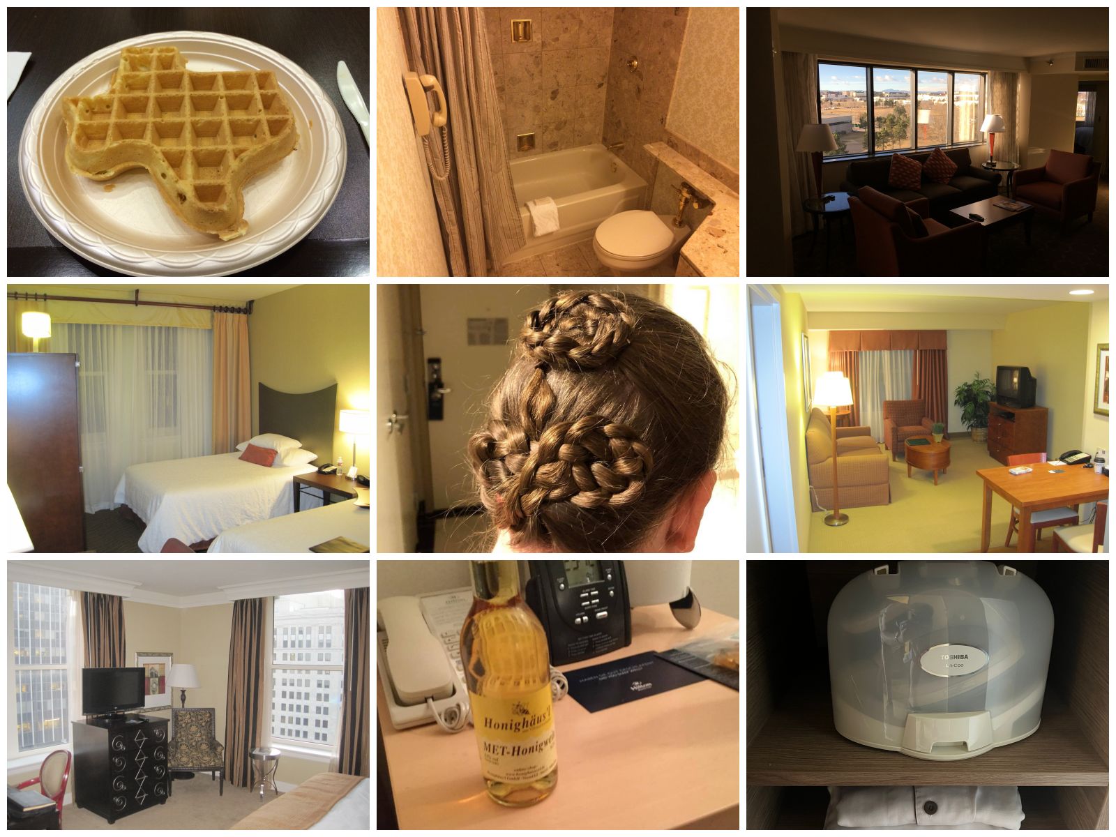 Left to right, top to bottom: Texas waffle inexplicably found at the Hampton Inn & Suites I‑35/Mulvane (Kansas, USA); bathroom phone at the Hilton Chicago (Illinois, USA); suite living room at the Embassy Suites by Hilton Denver Tech Center (Centennial, Colorado, USA); Hampton Inn & Suites Ogden (Utah, USA); Amy’s hair at the Hilton Columbus at Easton (Ohio, USA); Homewood Suites by Hilton Dulles-North/Loudoun (Virginia, USA); The Skirvin Hilton (Oklahoma City, Oklahoma, USA); Hilton Munich City (Germany); iron capsule at the DoubleTree by Hilton Hotel Naha Shuri Castle (Okinawa, Japan).