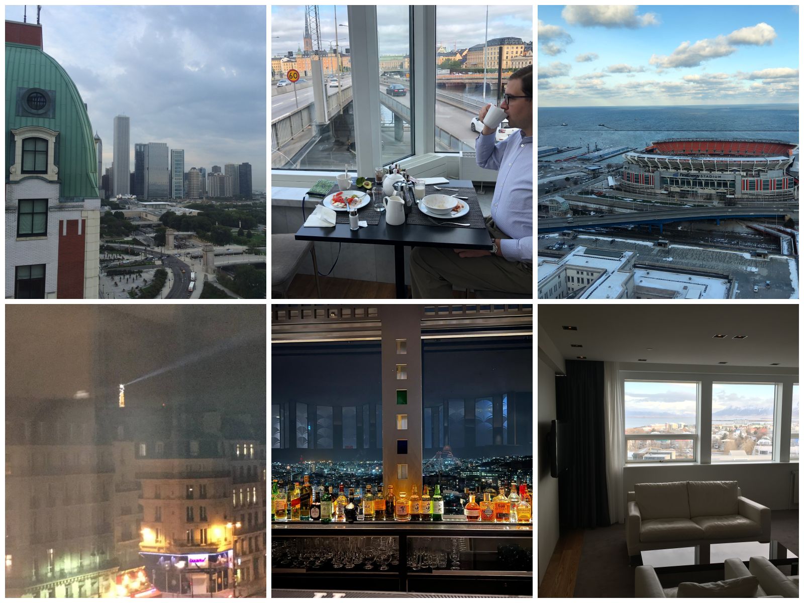 Left to right, top to bottom: partial skyline view from the Hilton Chicago (Illinois, USA); breakfast over a highway at the Hilton Stockholm Slussen (Sweden); view of the Cleveland Browns Stadium from the Hilton Cleveland Downtown (Ohio, USA); distant view of the Eiffel Tower from the Hilton Paris Opera (France); view of Naha from the 20th floor Sunset Lounge Bar at the DoubleTree by Hilton Hotel Naha Shuri Castle (Okinawa, Japan); view of Reykjavik from the Hilton Reykjavik Nordica (Iceland).