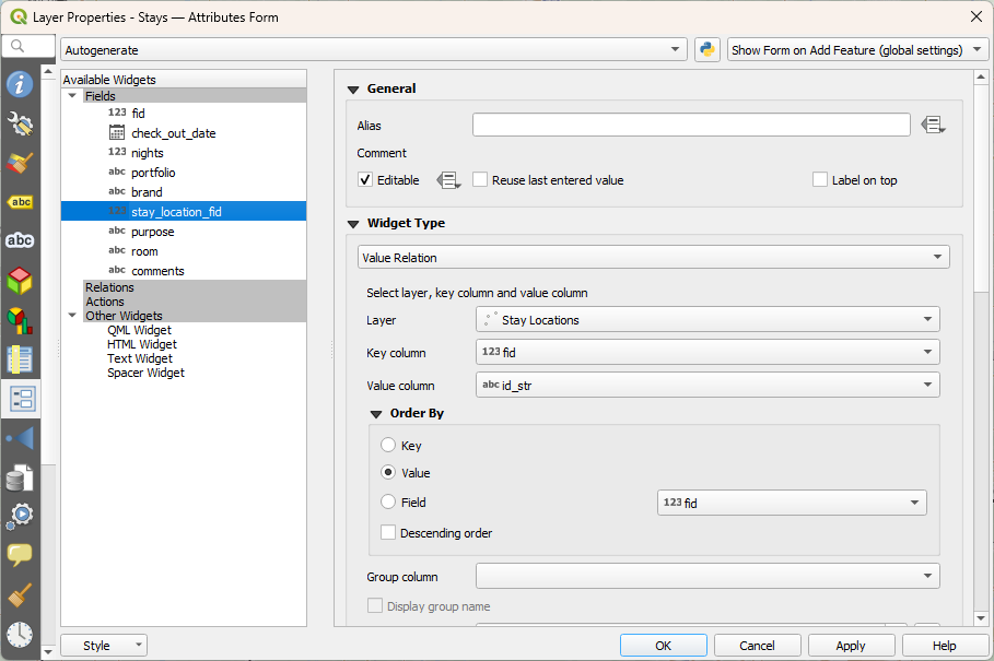 For each of the _fid join columns, I changed the Widget Type to Value Relation, selected the appropriate join Layer, set the key column to fid, and the value column to id_str. (In the case of joining to the cities layer, I set the value column to key.) Finally, I made sure to order by Value.