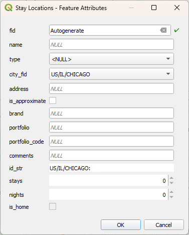Each GeoPackage layer can have a single geometry type (such as points, lines, or polygons) or no geometry. Since stays and homes both reference the locations table, I opted to have them have no geometry (only data), since their location could be derived from table joins. For each of the remaining four tables (stay_locations, cities, metros, and regions), I decided on using point (latitude and longitude) geometry. While the latter three could have also been represented by polygons, in reality, I was treating them like a single representative point (calculating distance to them or putting a marker on a map), so I opted to keep them as points. For each of these tables, I created a key column in a standardized format; if I need to show polygons at some point in the future, I can use that in QGIS to join them to polygon layers.