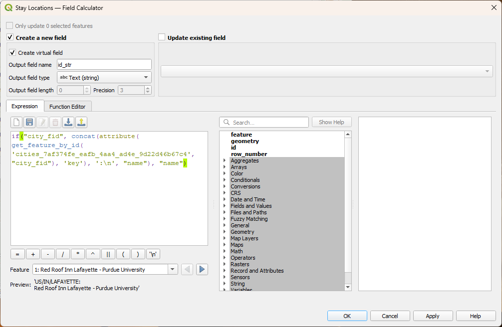 At the top, there’s a button with an abacus icon named Field Calculator. Selecting it brought me to the Field Calculator screen, allowing me to create a virtual field—a field that’s not stored in the GeoPackage, but instead is calculated as needed. I used it to create a QGIS expression for a good string label for the feature: