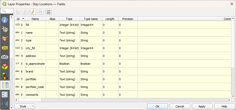 First, I created an id_str virtual field for each of the join target layers (stay_locations, cities, metros, and regions), which will be used as the text of the dropdown. To do this, I opened Layer Properties for each of these layers, and selected the Fields icon on the left, bringing me to the Fields screen: