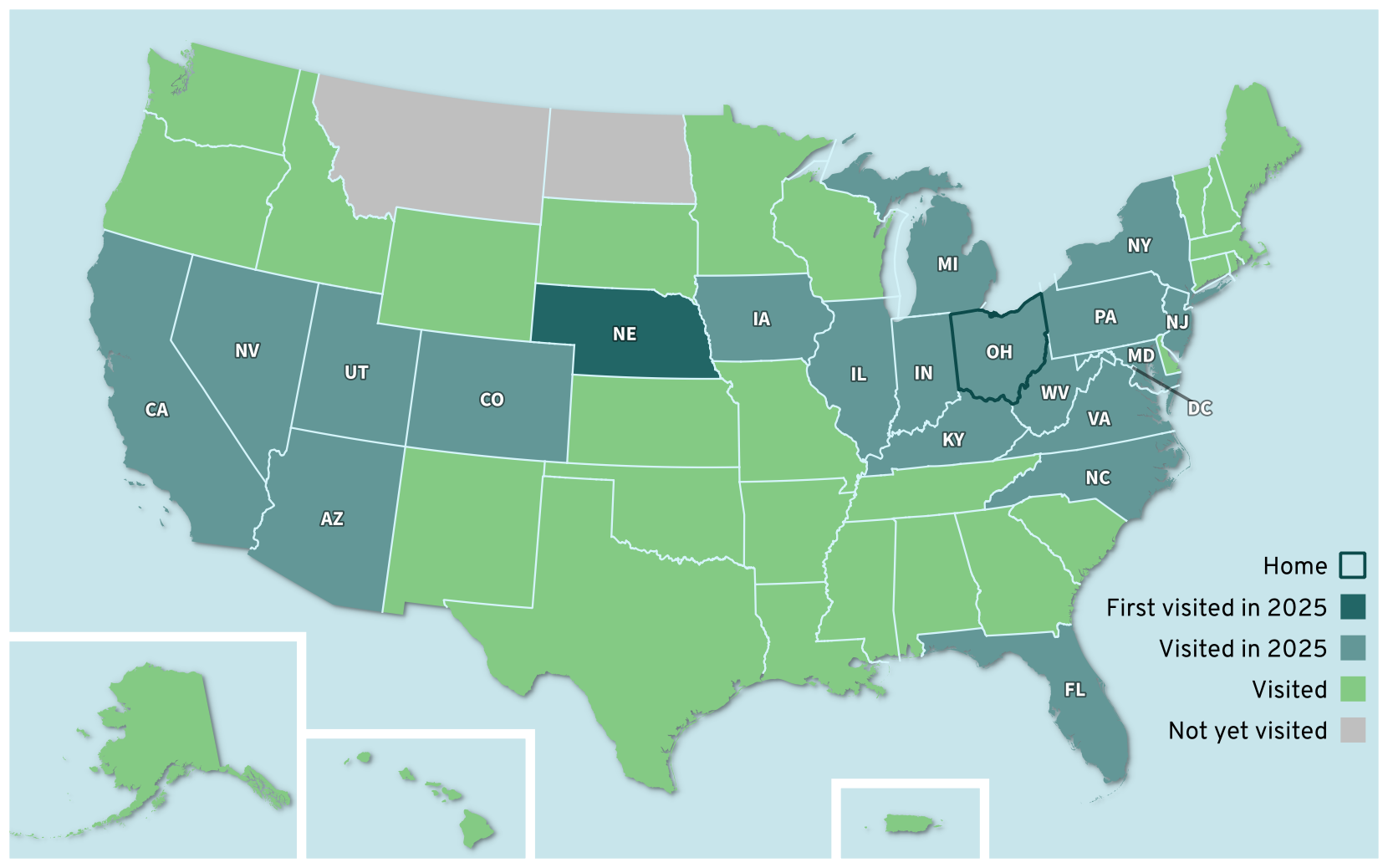 U.S. States and Territories Visited (2025). I visited Nebraska for the first time this year, leaving only two states for me to visit: Montana and North Dakota.