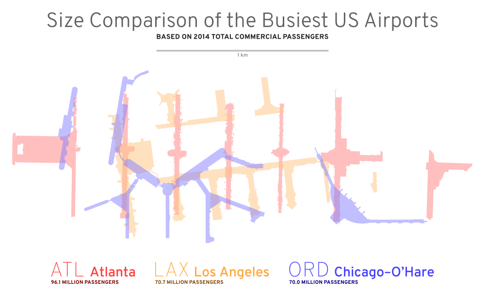 Now that I’ve built the terminal silhouettes for a number of airports, I can start to do some interesting things with them. For example, the three busiest airports in the United States—Atlanta, Los Angeles, and Chicago O’Hare—are all enormous, but I wondered how big they are compared to each other.